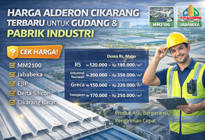 Harga Alderon Cikarang terbaru sangat dipengaruhi oleh tipe, ketebalan, panjang custom, dan volume pembelian. Untuk proyek gudang dan pabrik di kawasan industri seperti MM2100, Jababeka, EJIP, dan Delta Silicon, memilih supplier resmi sangat disarankan agar mendapatkan: